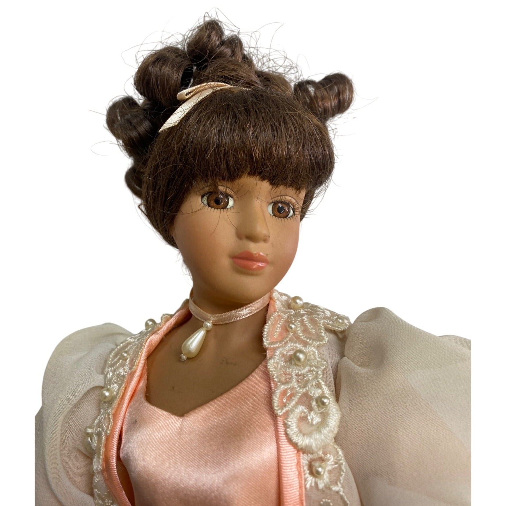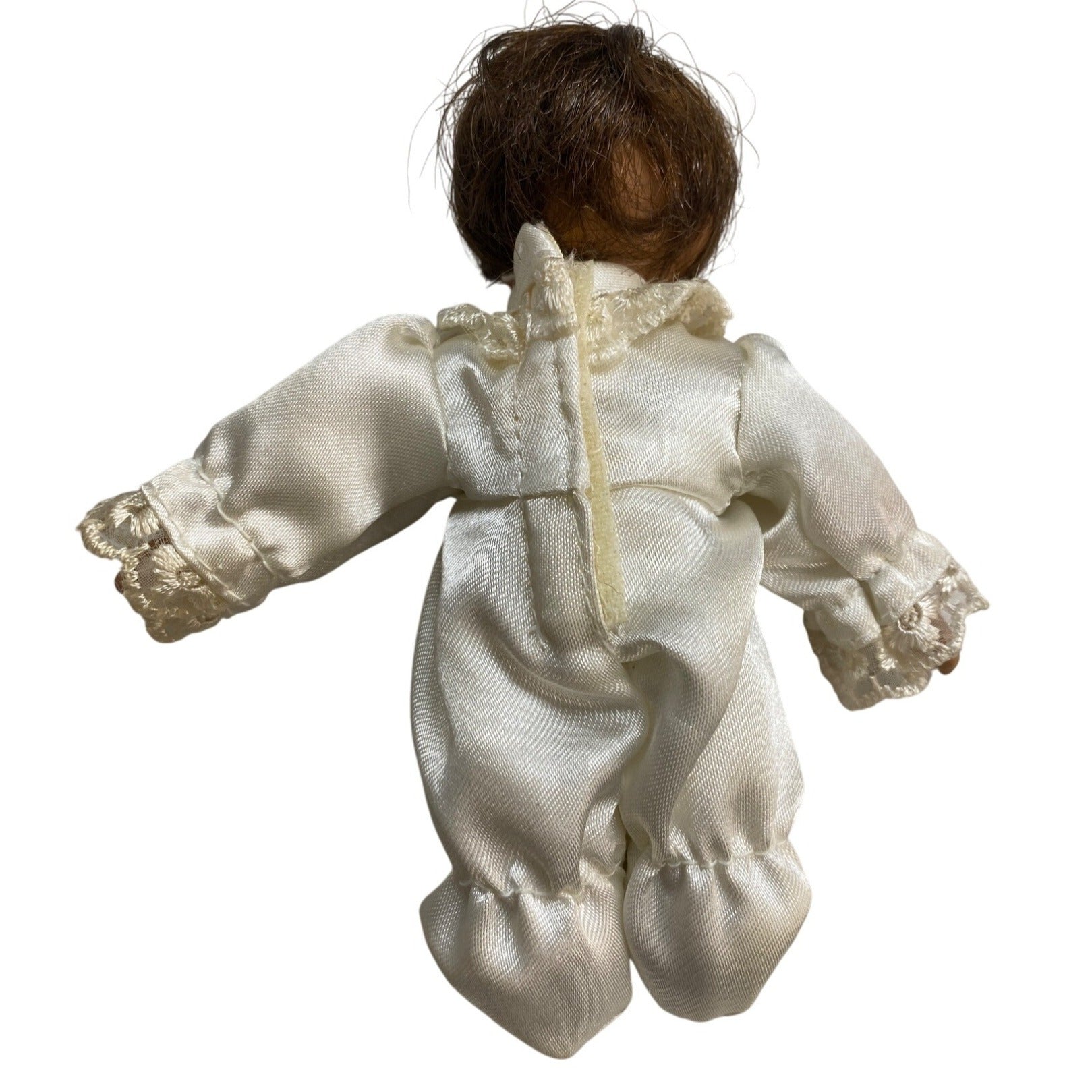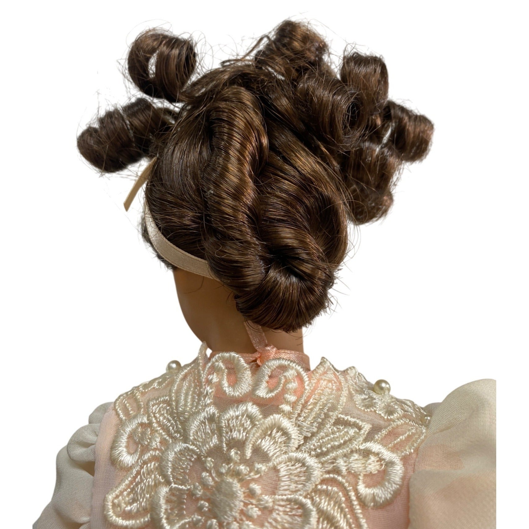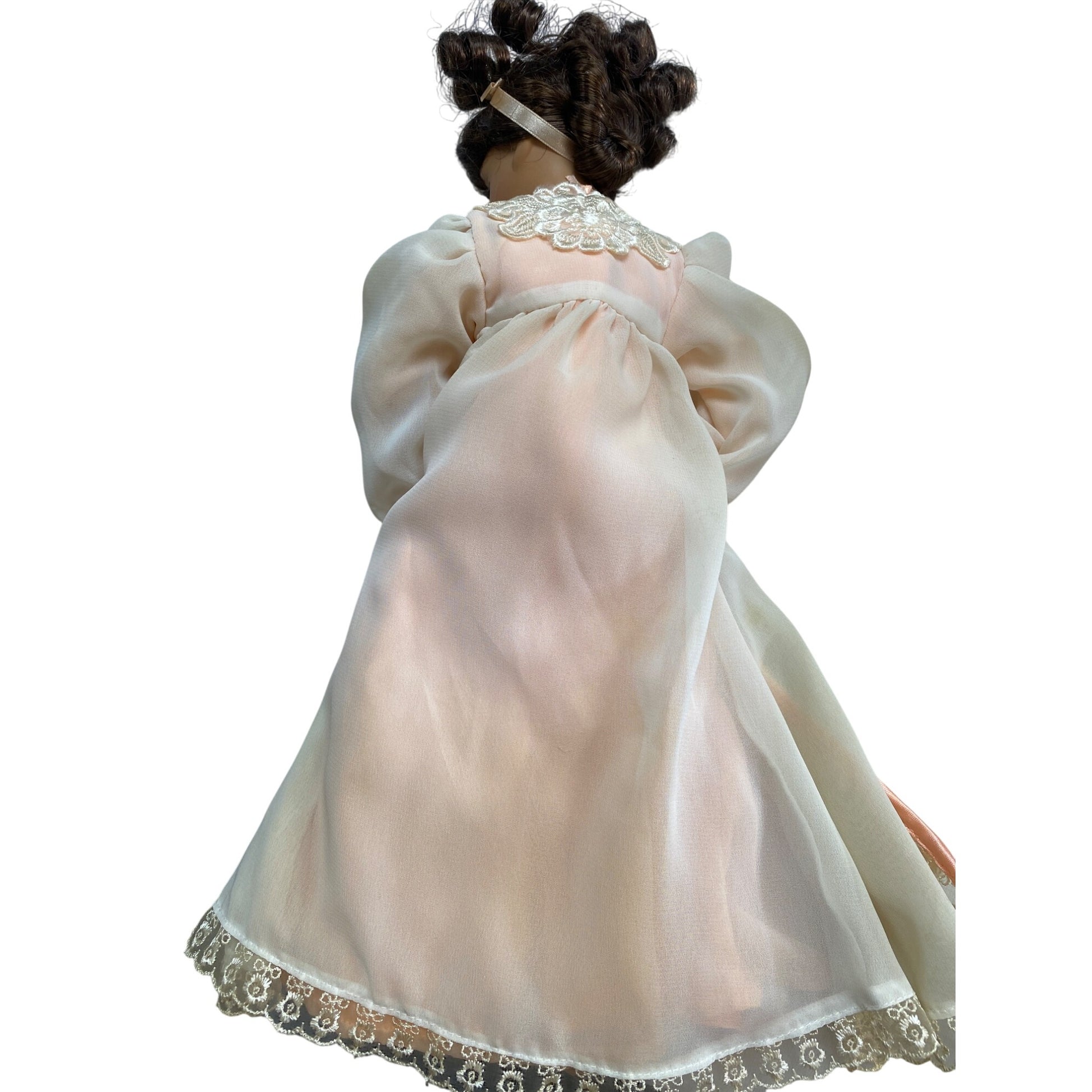 This vintage porcelain doll set exudes timeless elegance, featuring a mother and baby duo in delicate lace-trimmed attire. The included wooden rocking chair offers a charming display option, making it a cherished collectible that adds a touch of nostalgia to any home decor. Ideal for those who appreciate antique craftsmanship.