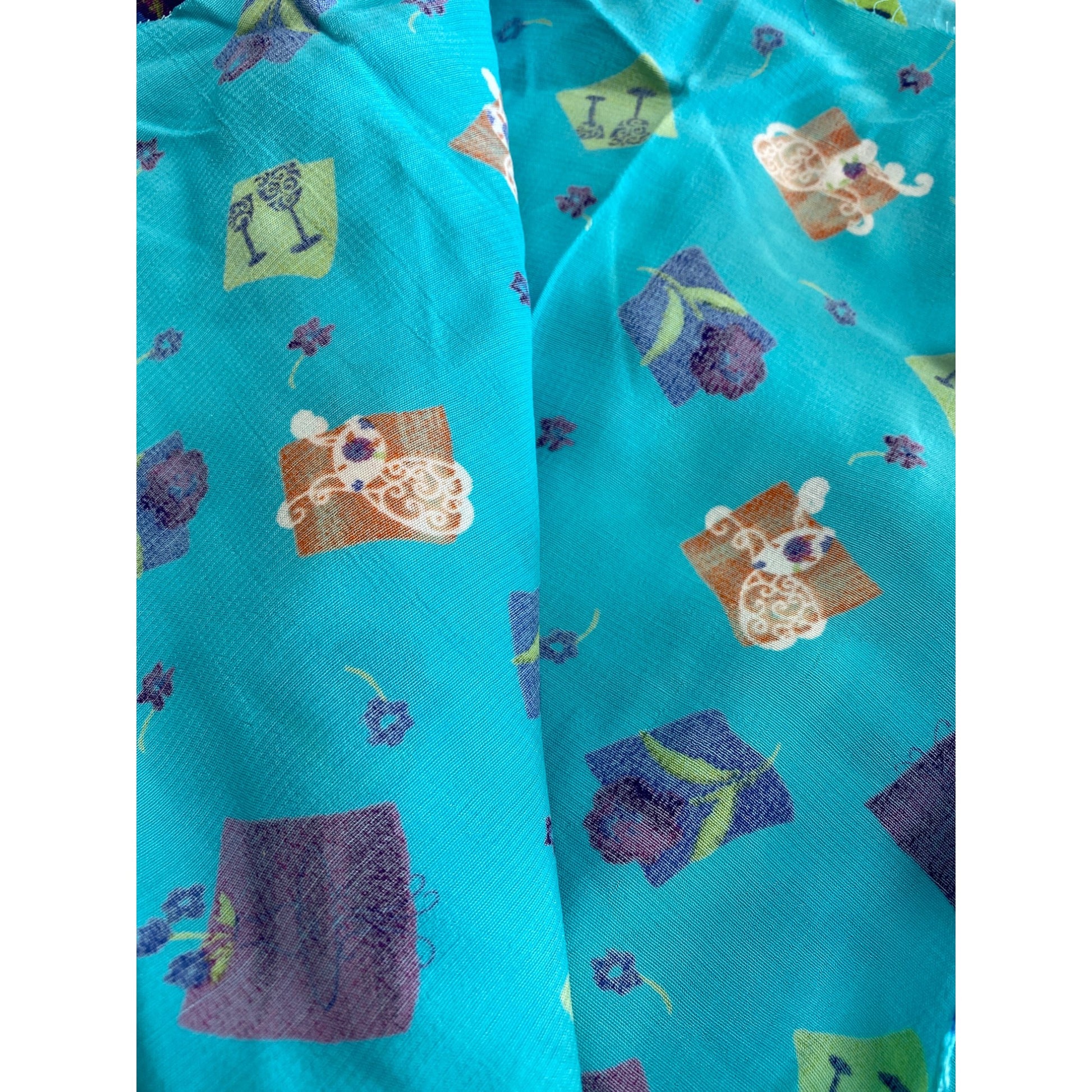 This vibrant fabric features a striking turquoise background adorned with a playful floral and abstract design. Ideal for crafting, sewing projects, or unique home décor, it offers a blend of color and creativity to inspire your next masterpiece. Add this distinctive vintage piece to your collection today.