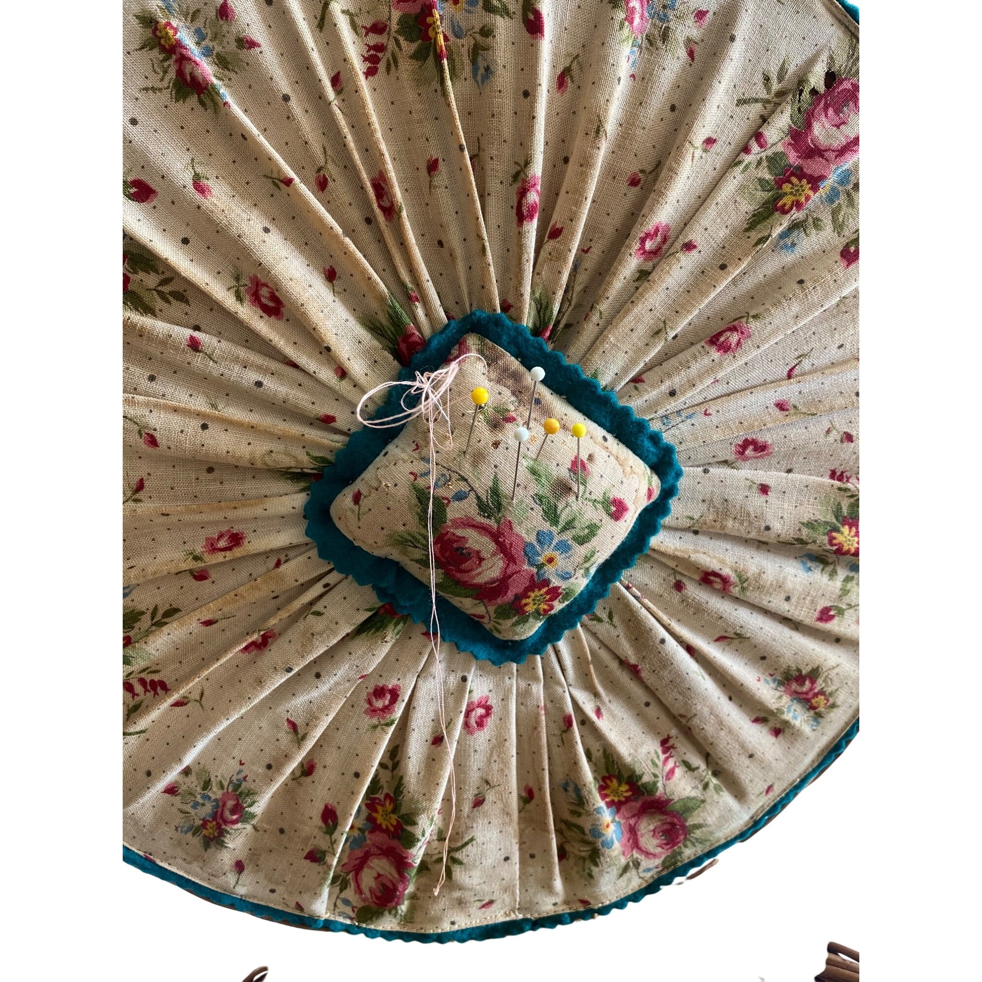 This vintage wicker sewing basket, with its intricate woven design and wooden lid handle, adds a charming touch to any sewing space. The floral fabric lining offers a classic aesthetic, while the basket provides ample storage for sewing essentials, keeping them organized and easily accessible.