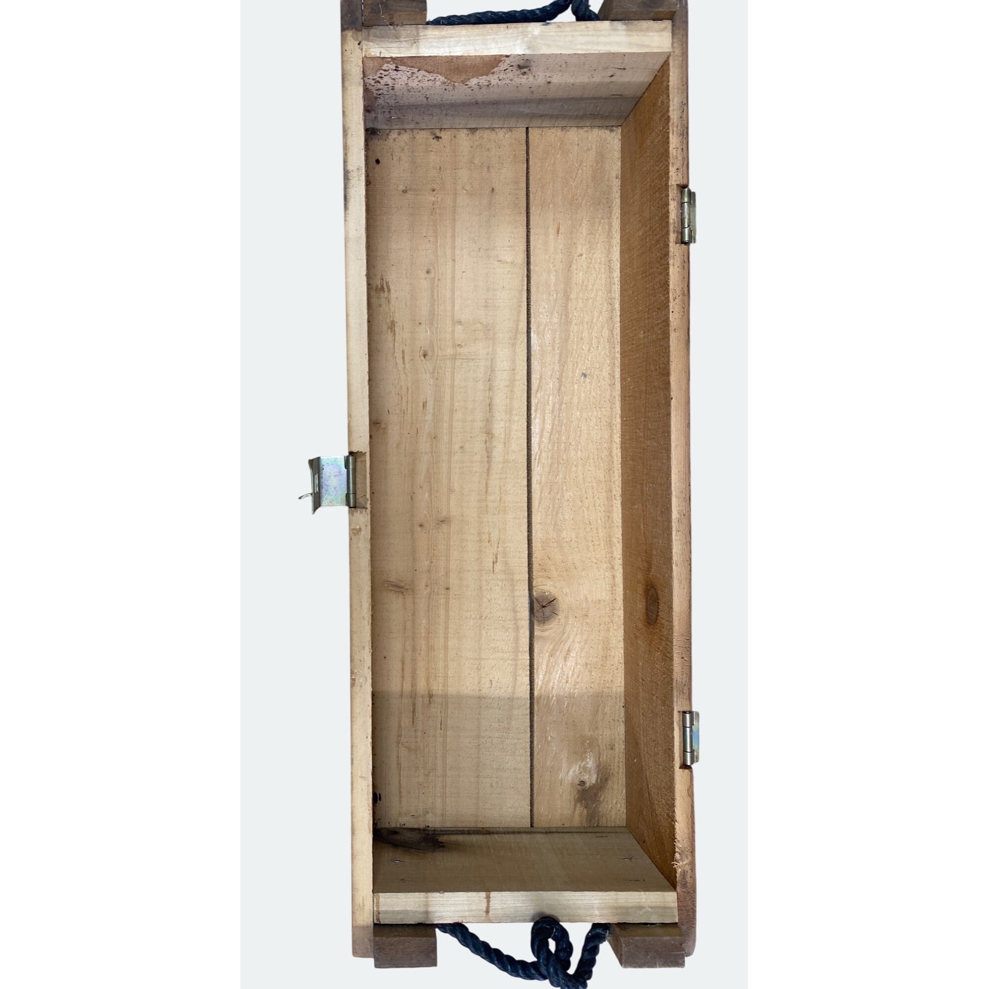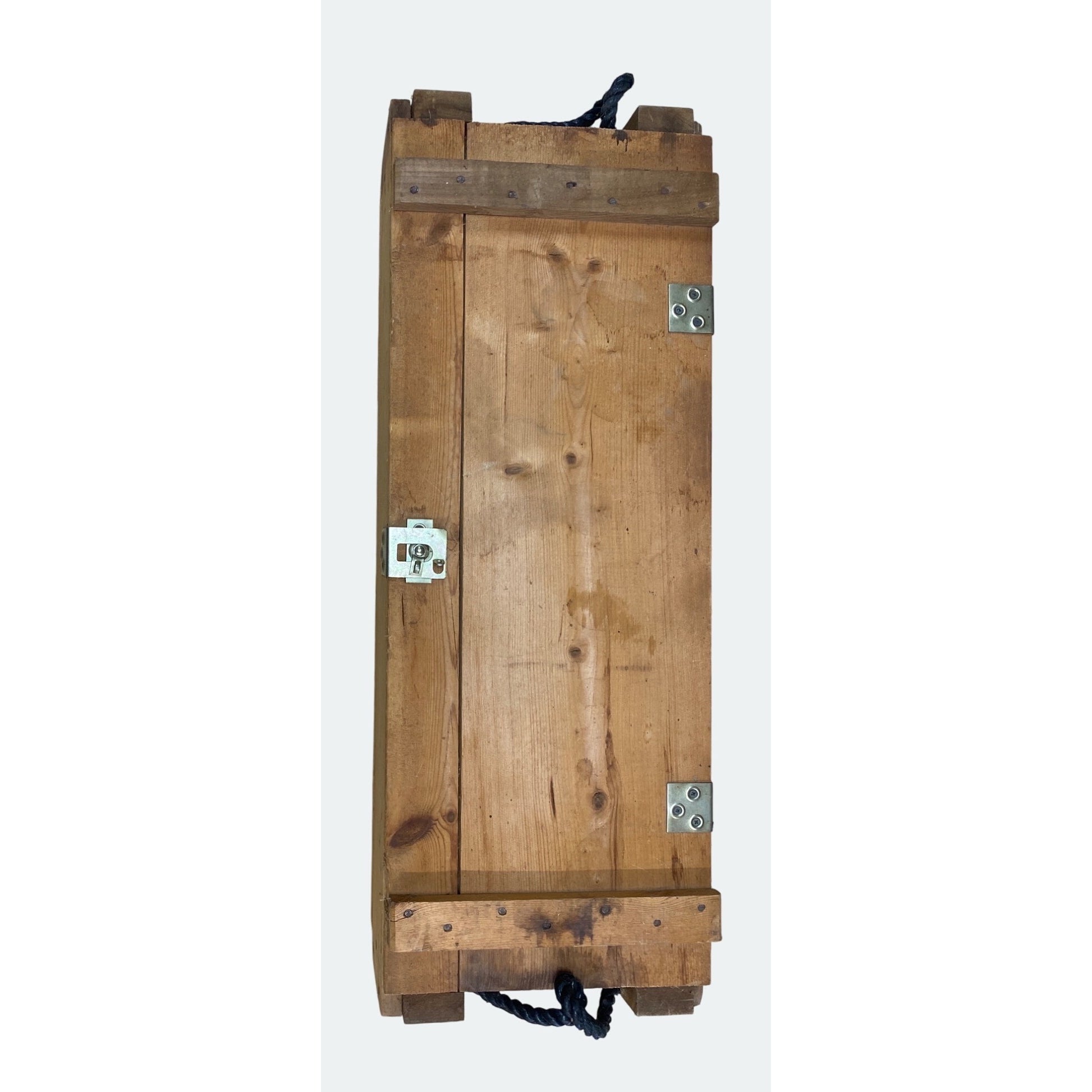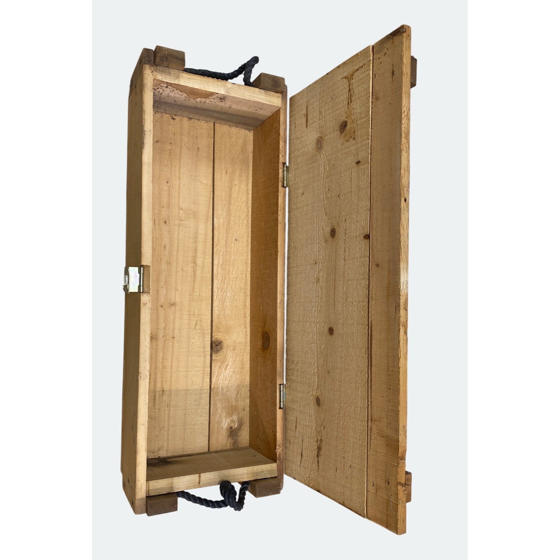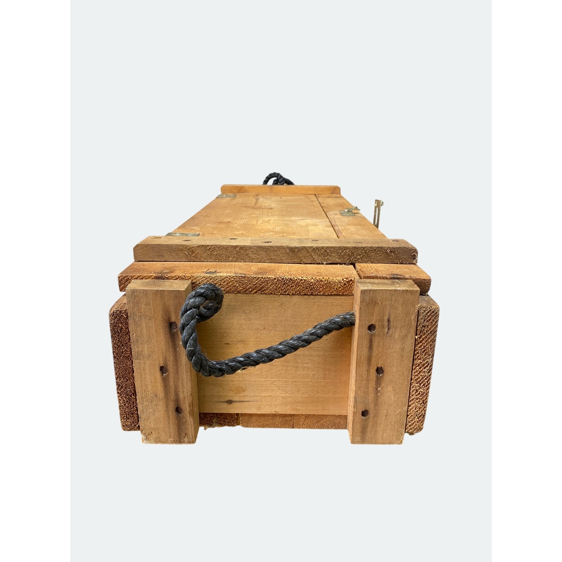 Enhance your space with this rustic wooden storage box. Its sturdy construction, metal latch, and rope handles deliver both function and style.