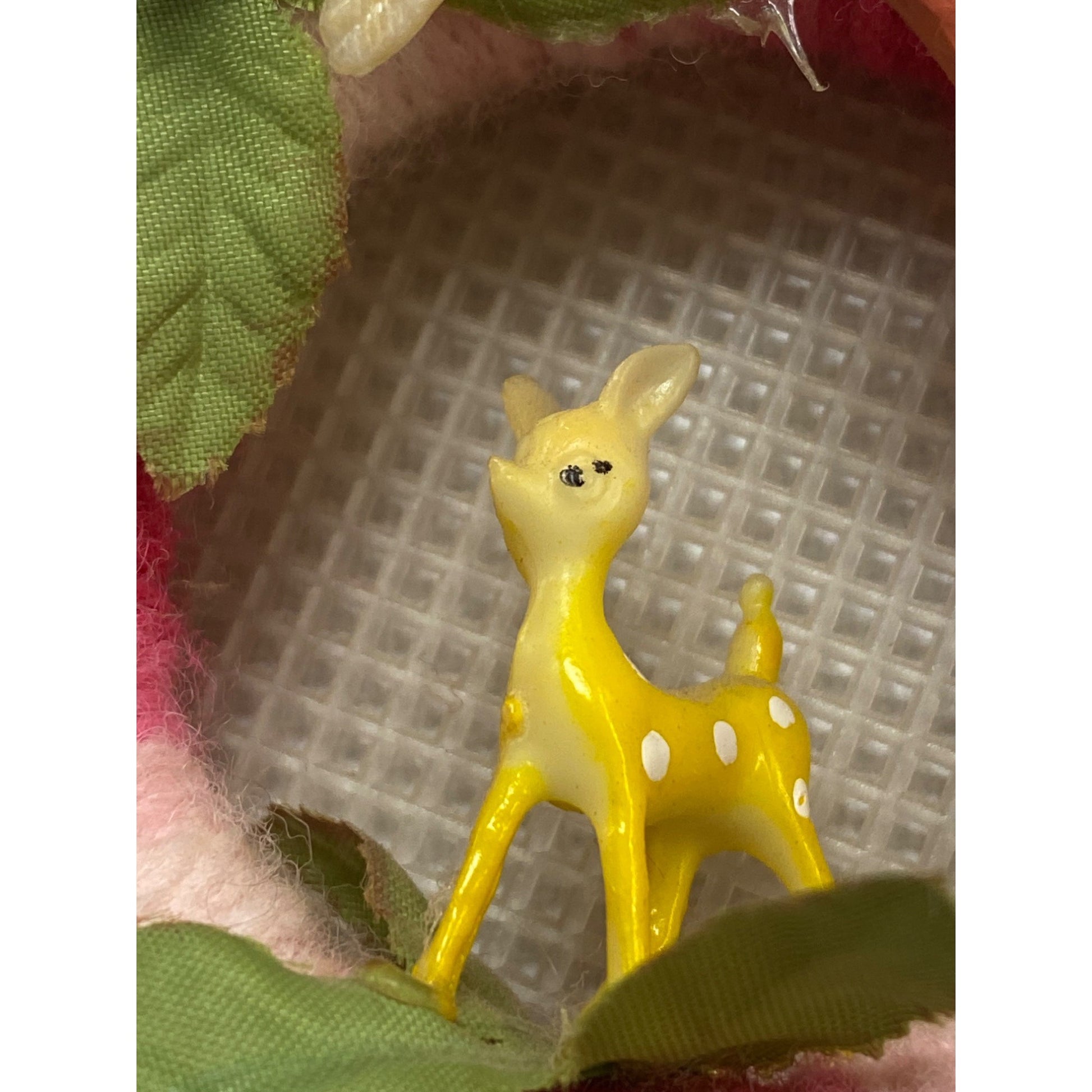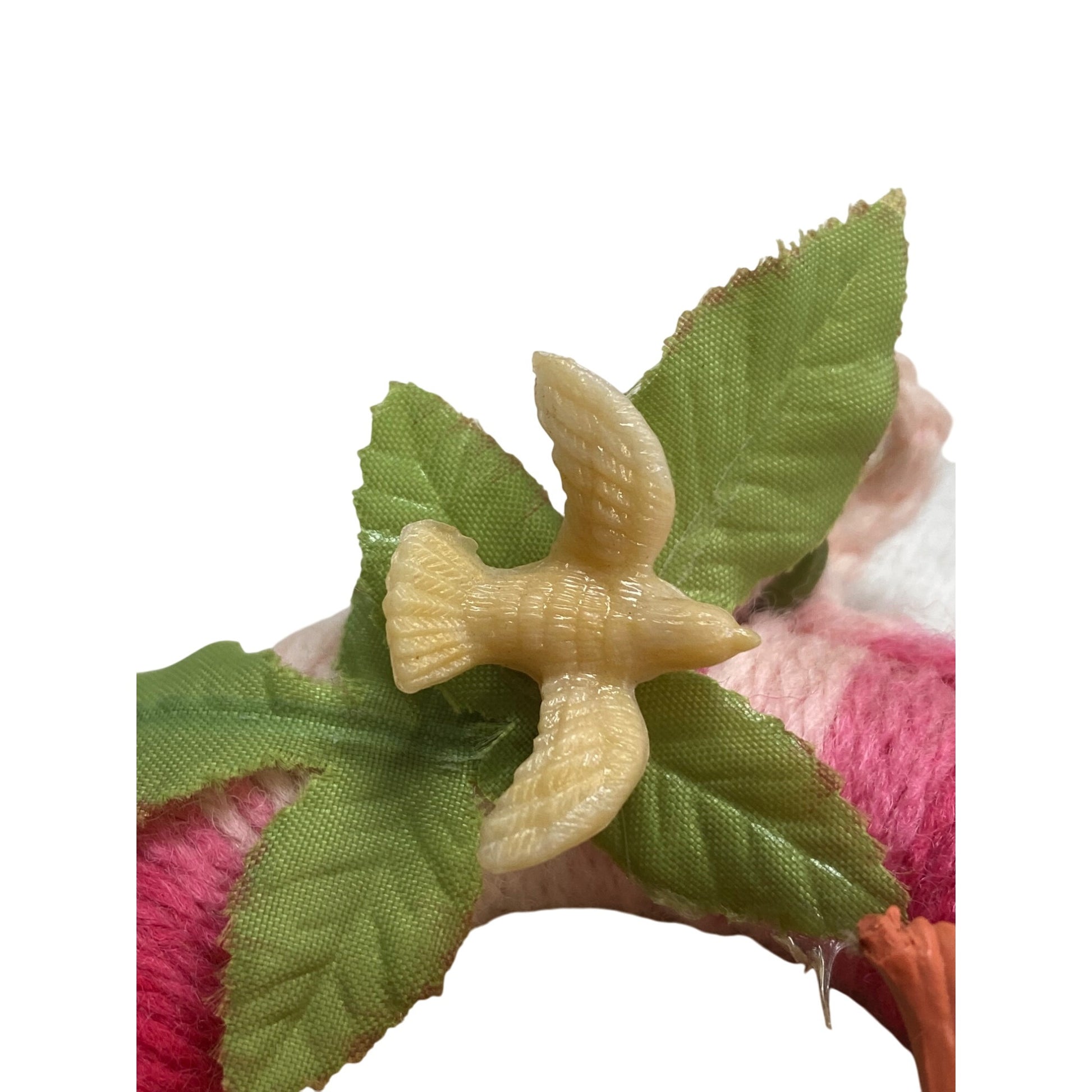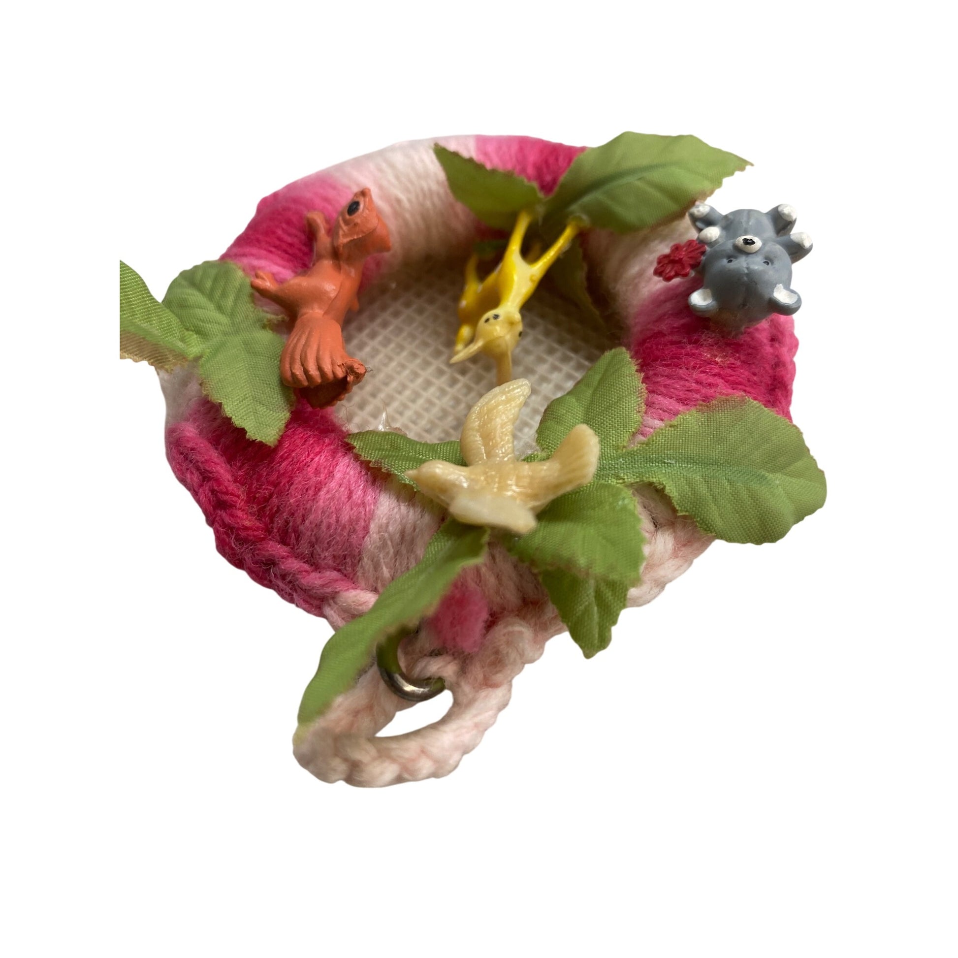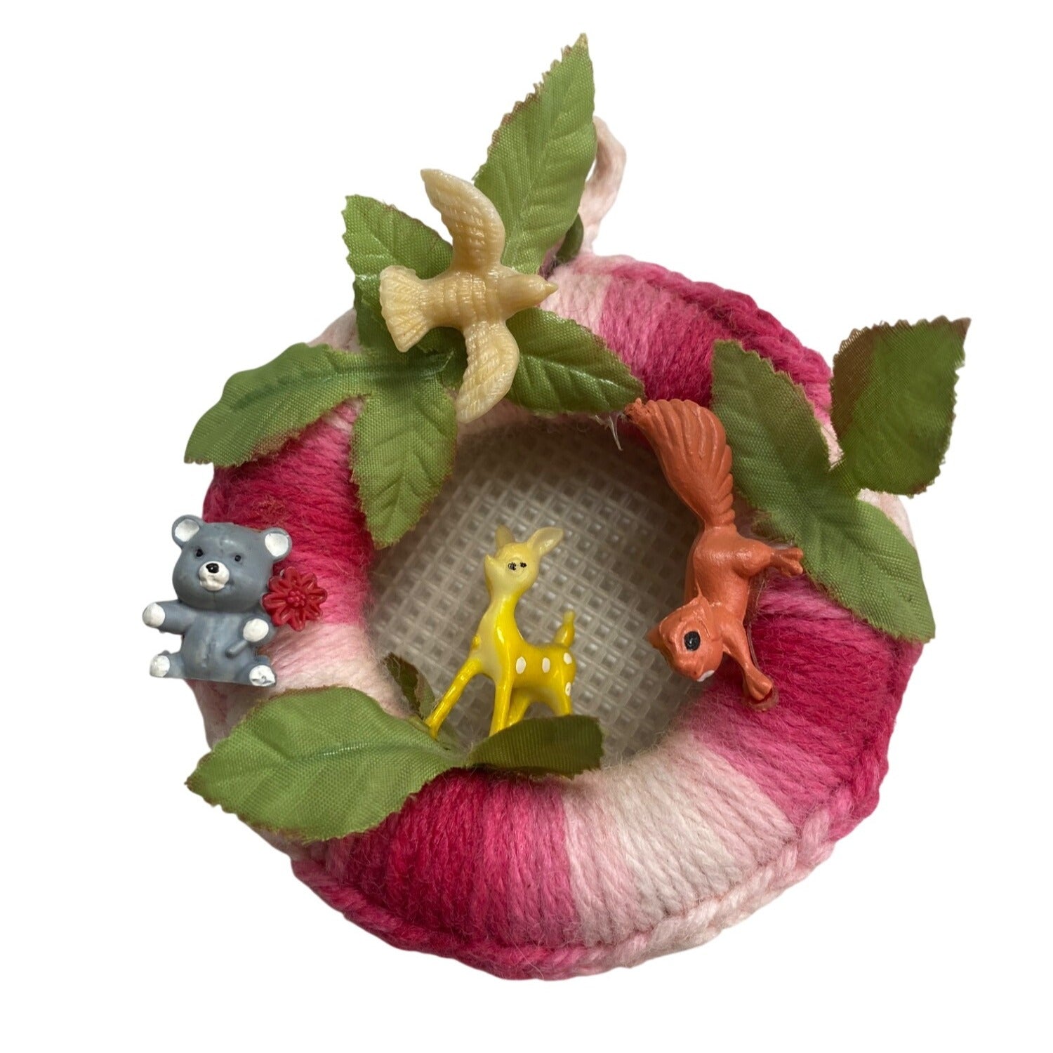 Enhance your decor with this charming handmade yarn wreath. Adorned with delightful plastic animals and lush leaves, it's a unique accent piece. Lightweight and easy to hang, it adds a whimsical touch to any room. Ideal for nature enthusiasts and vintage collectors, this lovely wreath brings a touch of nostalgia.